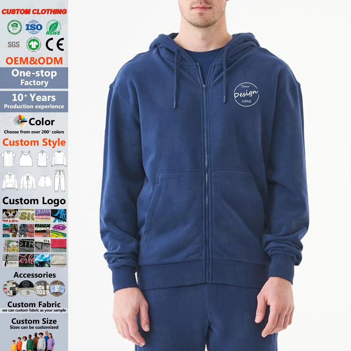 JL121C Embroidered Oversized Cozy Cotton Poly Hoodie Men Heavyweight Fabric Drop Shoulder Baggy Zip up Hooded Sweatshirt